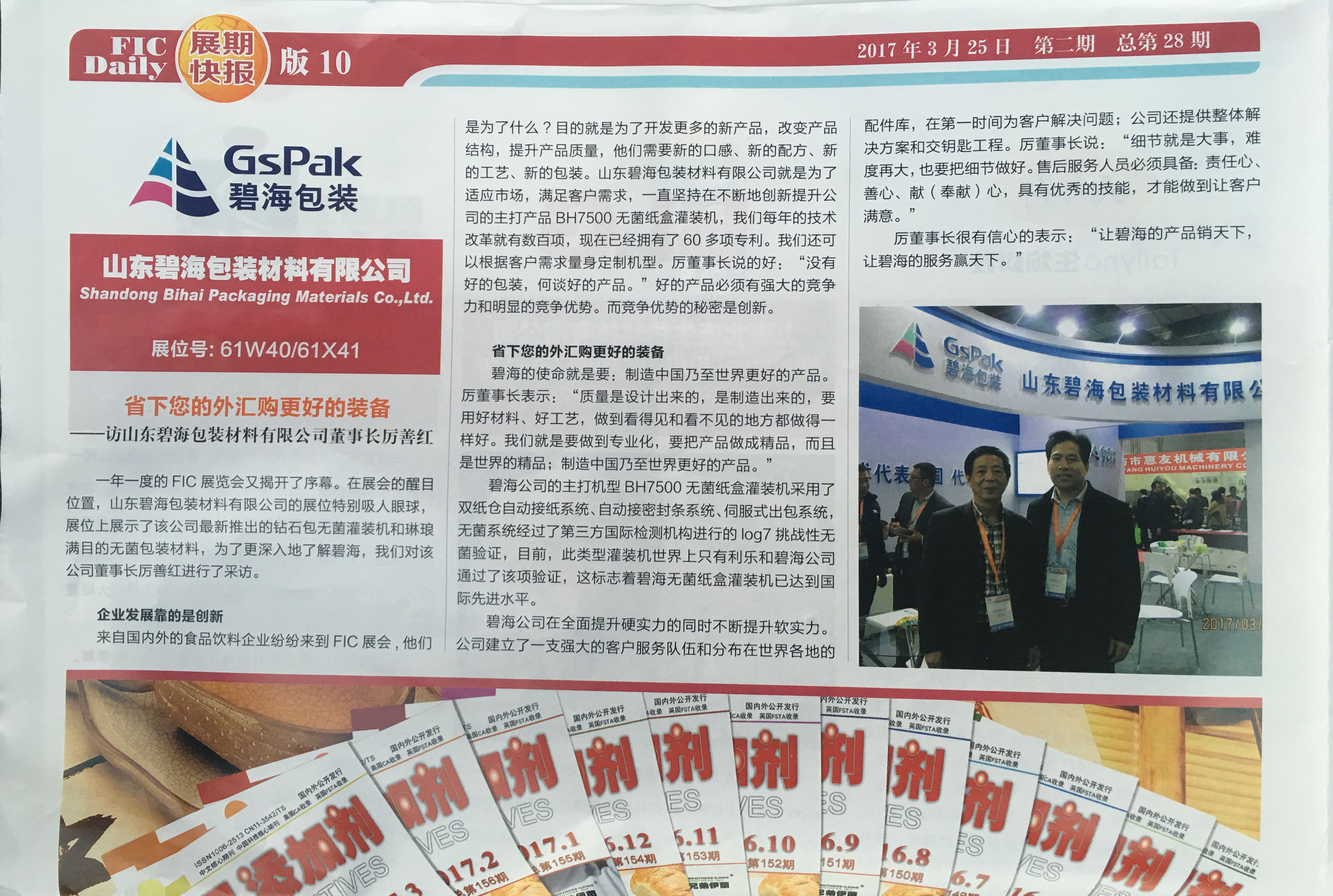 來自國內外的食品飲料企業紛紛來到FIC展會,他們是為了什么?目的就是為了開發更多的新產品,改變產品結構,提升產品質量,他們需要新的口感、新的配方、新的工藝、新的包裝。山東碧海包裝材料有限公司就是為了適應市場,滿足客戶需求,一直堅持在不斷地創新提升公司的主打產品BH7500無菌紙盒灌裝機,我們每年的技術改革就有數百項,現在已經擁有了60多項專利。我們還可以根據客戶需求量身定制機型。厲董事長說的好:“沒有好的包裝,何談好的產品。”好的產品必須有強大的競爭力和明顯的競爭優勢。而競爭優勢的秘密是創新。
